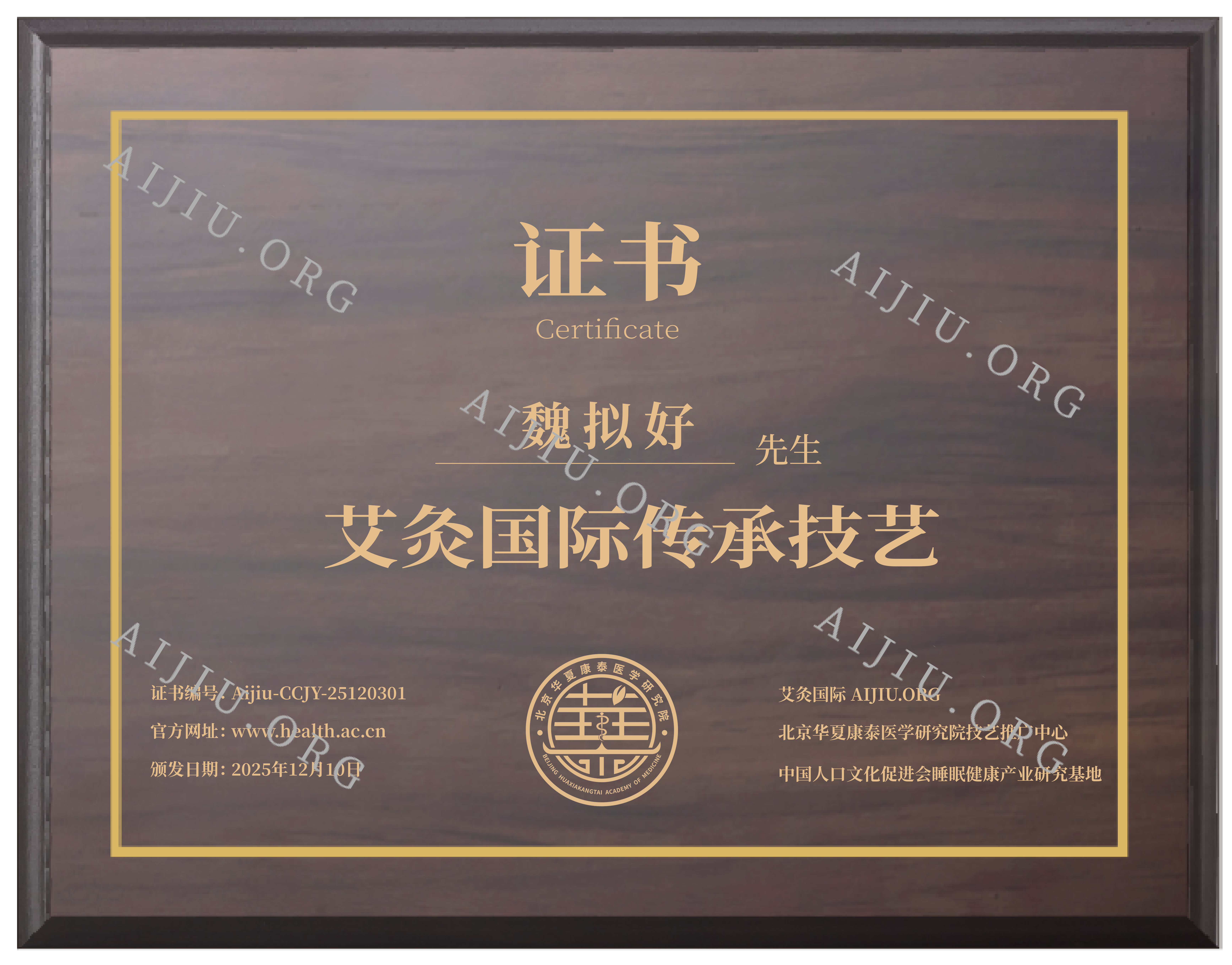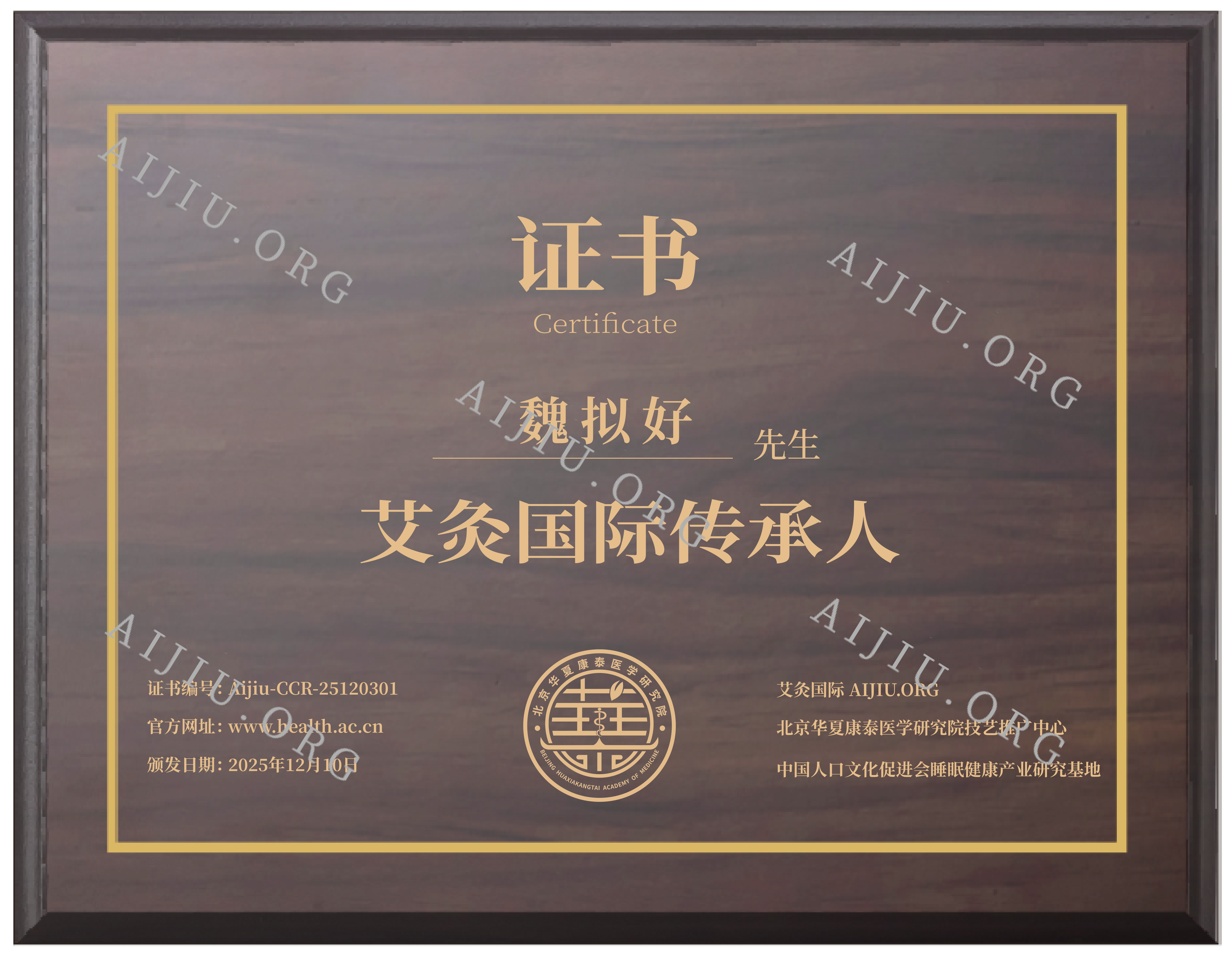 “艾灸国际传承人”证书旨在认可个人在艾灸领域的研习与实践成就。它表明持证人系统掌握了传统艾灸技法与理论,并致力于在国际范围内传播这一健康技艺。